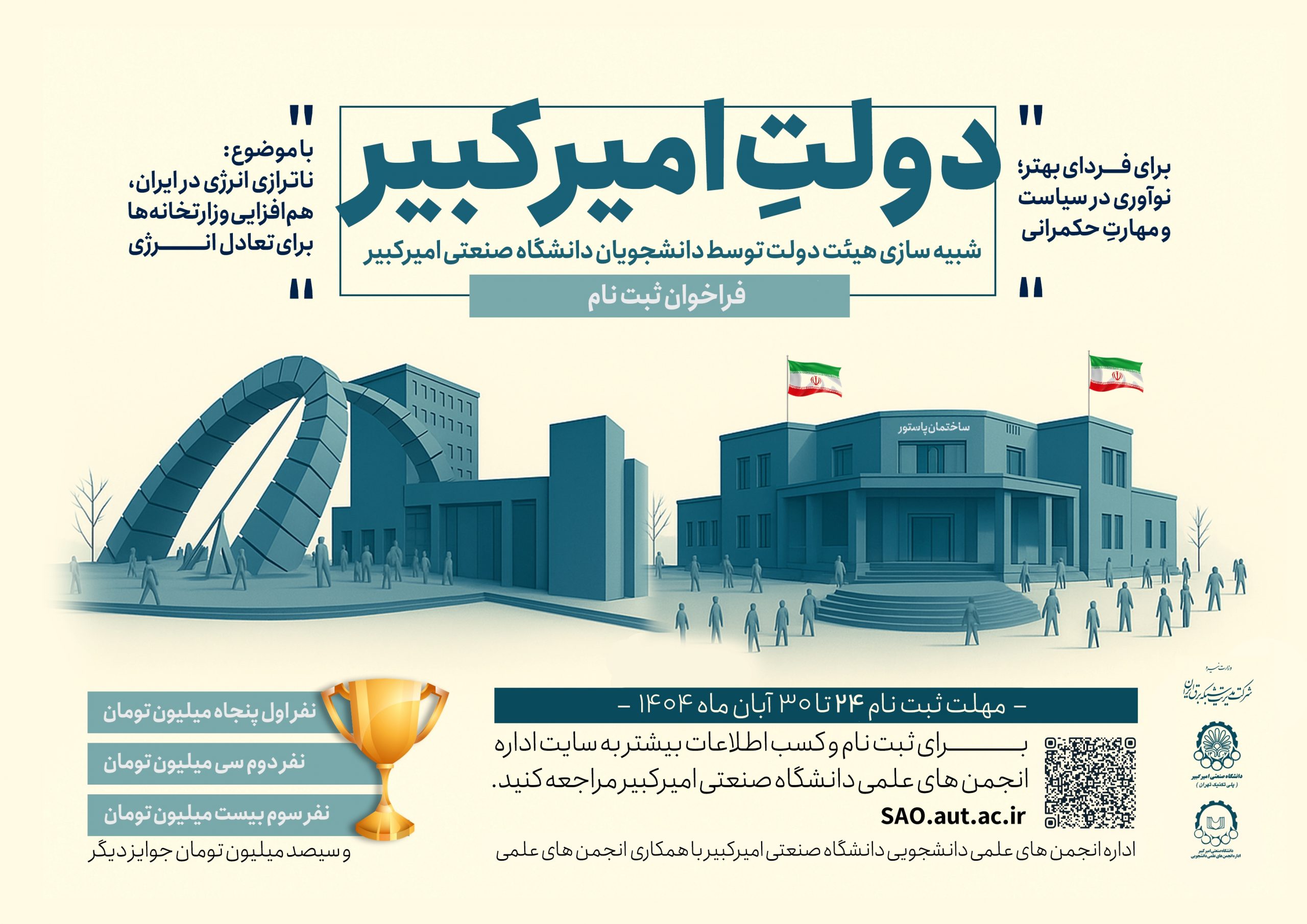 انجمنهای علمی دانشگاه صنعتی امیرکبیر با هدف ارتقای توانمندیهای سیاستگذاری، تحلیل بینرشتهای و تصمیمسازی در میان دانشجویان، نخستین دوره رویداد «دولت امیرکبیر» را برگزار میکنند. این رویداد با همکاری شرکت مدیریت شبکه برق ایران، بهعنوان یکی از نهادهای تخصصی صنعت انرژی کشور، طراحی شده است تا بستری واقعی برای تمرین سیاستگذاری در فضای دانشگاهی و ایجاد تعامل میان دانشجویان و افراد شاخص صنعت انرژی کشور فراهم نماید.